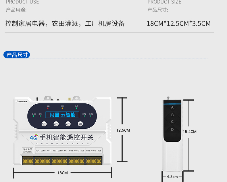4G一路手机远程遥控开关(A8系列) 产品规格 功能特点 资料下载 品名:GPRS手机遥控开关 型号:YS-A8-1 控制方式:手机APP/RF遥控/手动控制 传输方式:GPRS传输 控制距离:无限距离,手机有信号就能控制;(RF遥控器4000米) 工作电压:220v、380v通用 产品尺寸:控制器180*125MM、遥控器136*43MM 用途:家电控制、农田灌溉、工厂机房设备。多个控制器可在一个app上绑定控制!功能强大便捷!