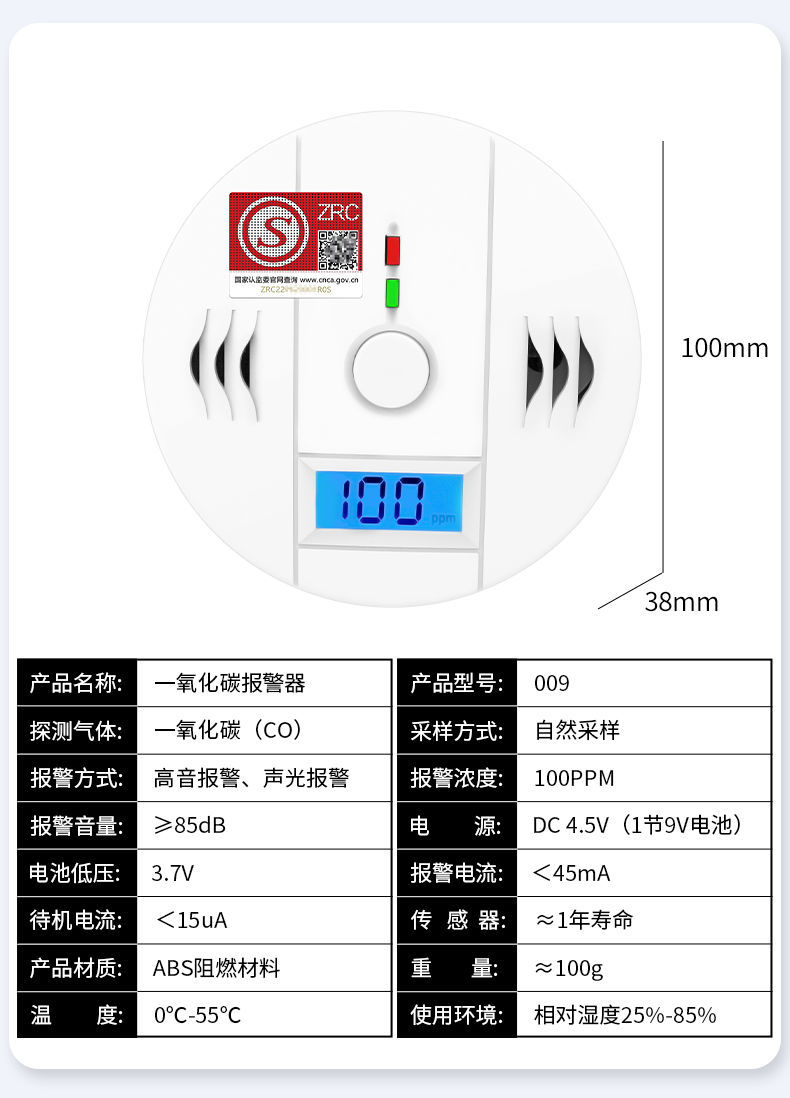 一氧化碳报警器(型号PA-009) 产品规格 功能特点 资料下载 一氧化碳报警器(型号PA-009)1.检测气体、烧煤、烧柴、烧炭、蜂窝媒、露营封闭环境、封闭车内2.85分贝报警音量3..LED液晶屏幕显示4.故障自检: 绿灯(正常)、黄灯 (故障、需要检修) 红灯(气体浓度超标)5.报警方式:蜂鸣声提示 6. 产品保险:1000万承险7. ABS阻燃材质适用场景:适用于厨房、浴室、起居室、火锅包厢、饭堂等长时间空气不流通的场所安装一氧化碳报警探测器